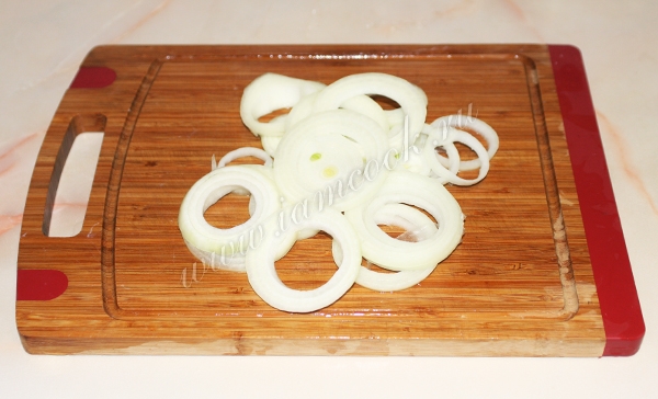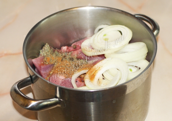 Маринад для шашлыка из индейки готовится очень просто. Мясо выложить в кастрюлю. Добавить нарезанный ранее лук. Приправить базиликом, красным молотым перцем, солью, добавить черный душистый перец горошком. Все аккуратно перемешать руками, так чтобы не поломать лук.