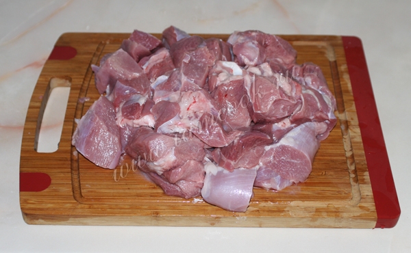 Филе бедра индейки хорошенько вымыть и нарезать кусочками среднего размера 5-7 сантиметров.