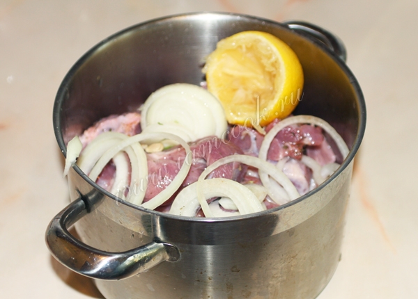 Лимон разрезать пополам и выдавить обе половинки в кастрюлю. Еще раз немного перемешать. Оставить на 1-2 часа. Затем влить полстакана прохладной воды, а сверху положить блюдце и придавить. Накрыть кастрюлю крышкой и оставить мариноваться не менее чем на 8 часов.