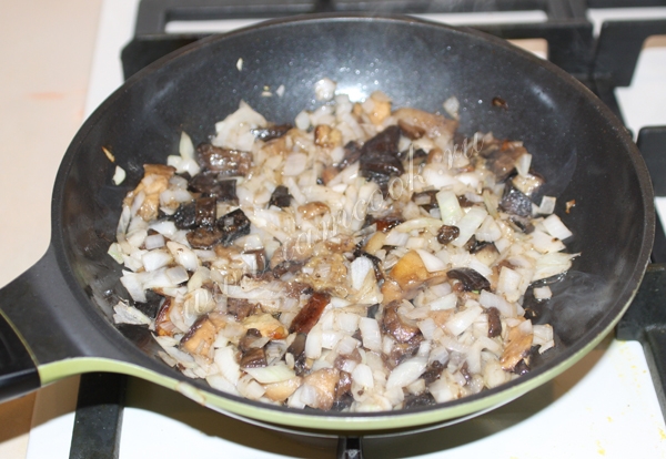 В сковороде разогреть растительное масло и обжарить лук с грибами помешивая, до готовности, примерно 10 минут.
