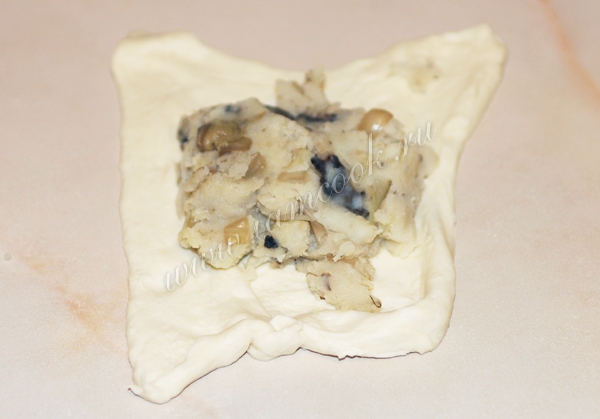 Готовое слоеное дрожжевое тесто разрезать на квадратики. Слегка растянув каждый квадратик вложить на него начинку при помощи столовой ложки.