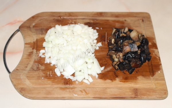 Мелко нарезать репчатый лук и грибы. Грибы у меня были благородные, замороженные с прошлого сезона.