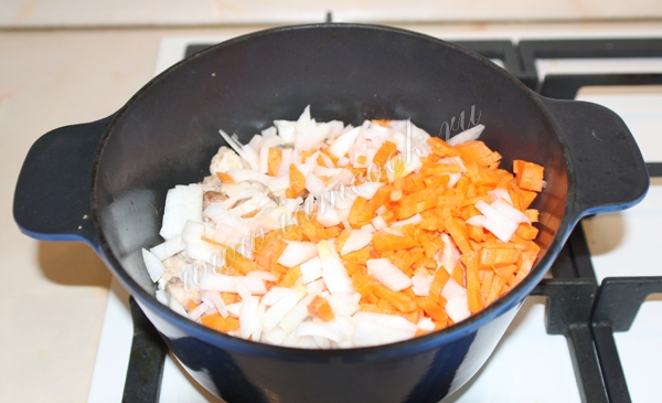 Морковь и лук выложить в казан к мясу. Перемешать, накрыть крышкой, убавить огонь и тушить 15-20 минут.