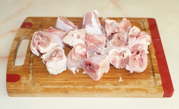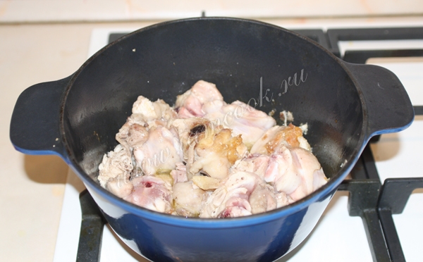В казане разогреть 100 мл растительного масла и выложить курицу кусочек за кусочком. Обжарить мясо примерно 10 минут на среднем огне, изредка помешивая, чтобы оно не пригорало.