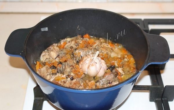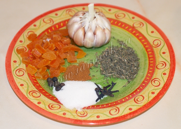 Тем временем приготовим приправы: очищенную и тщательно вымытую головку чеснока, барбарис (у меня к сожалению его не было, поэтому пришлось заменить курагой), красный молотый перец, зиру, гвоздику, черный перец горошком и соль.