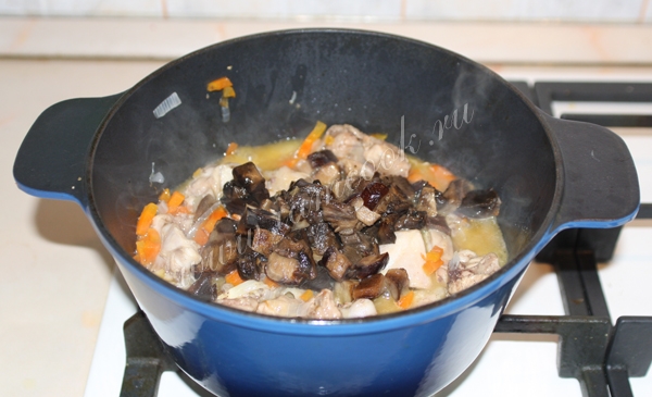 Добавить в казан грибы, перемешать, накрыть крышкой и продолжить тушить еще 10 минут.