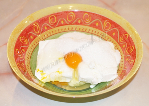 Вторым немаловажным этапом является приготовление начинки. Для этого в глубокое блюдо выложите 600 грамм творога, полстакана сахара и разбейте 2 яйца. На этом же этапе можно добавить изюм, мелко нарезанный чернослив или курагу.