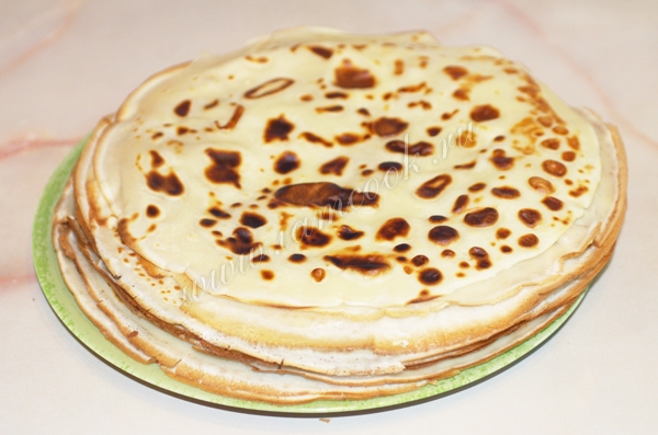 Для начала необходимо испечь блины, не тонкие и не толстые, на молоке или кефире. Как это сделать, можно посмотреть здесь.