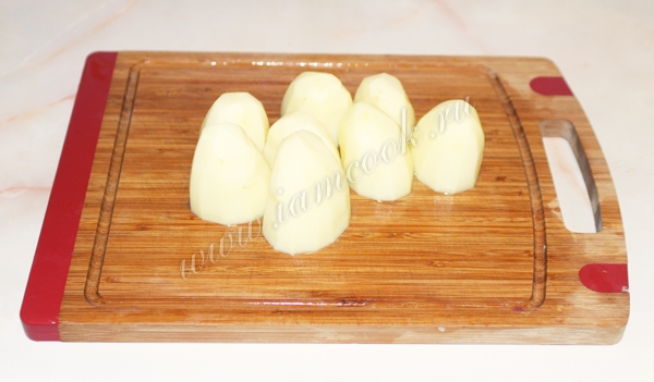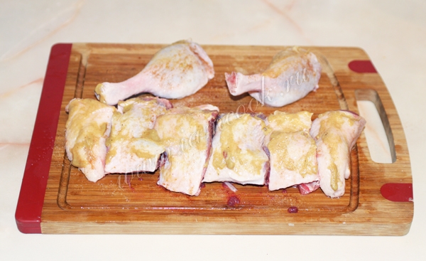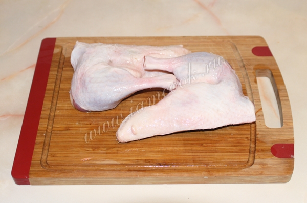 Разрезать утку на крупные порционные куски, натереть солью и красным перцем, смазать горчицей. Оставить мариноваться на 20 минут. Тем временем можно заняться яблоками и картофелем.