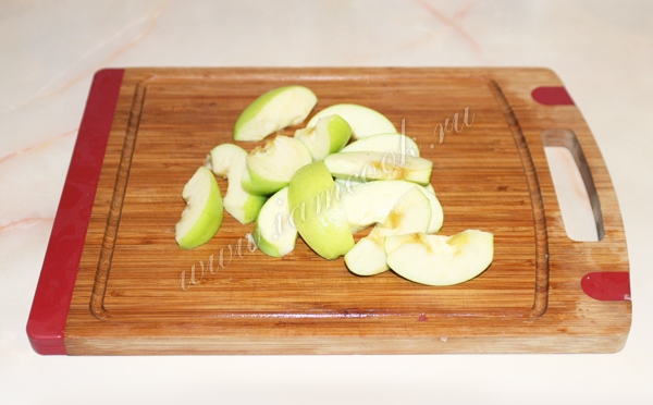 Яблоки вымыть, разрезать пополам, извлечь сердцевину и нарезать дольками.