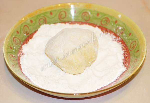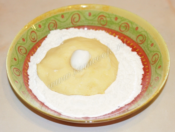 На глубокую тарелку высыпать 1,5 стакана муки. Взять кусок картофельного теста, размером чуть меньше кулака и сформировать из него лепешку. Выложить лепешку на тарелку с мукой и сделать в ней небольшое углубление пальцами. Положить 1-2 кусочка сыра Моцарелла в зависимости от размера.