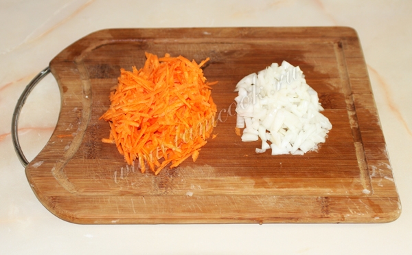 Пока наш картофель варится, займемся обжаркой. Морковь натереть на терке, а лук мелко порубить.