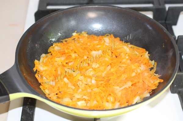 На сковороду вылить 2 столовые ложки растительного масла и слегка обжарить овощи, около 5-ти минут, помешивая.