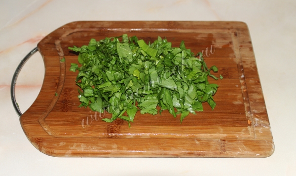 Тем временем необходимо освободить листья щавеля от стеблей и произвольно нарезать их.