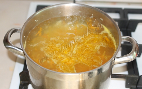 Примерно через 5-7 минут после закипания воды в кастрюле с картофелем, добавить в нее нашу обжарку, также добавить перец горошком. Убавить огонь и оставить вариться на 10 минут.