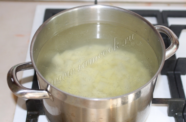 Положить картошку в кастрюлю, залить 2-мя литрами воды и поставить на огонь. В момент закипания устранить образовавшуюся пенку.