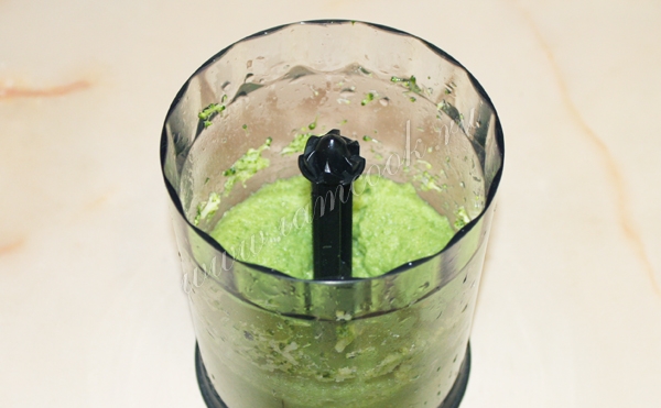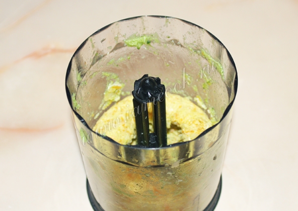 Капусту брокколи измельчить блендером до мелко-дисперсной массы.