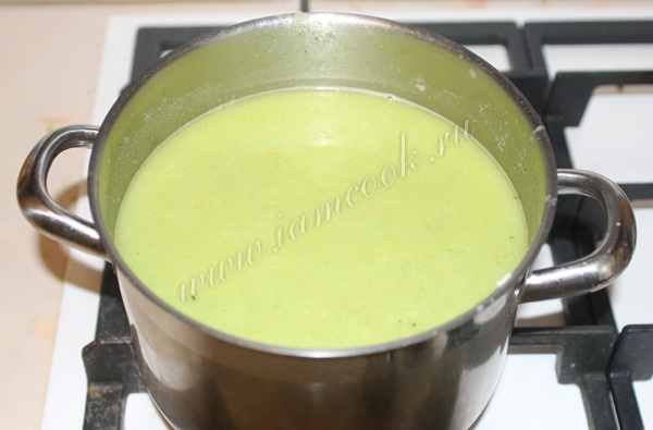 Бульон поставить на огонь и выложить в него измельченную в блендере капусту брокколи, курицу и обжарку. Помешивая венчиком довести всю смесь до кипения.