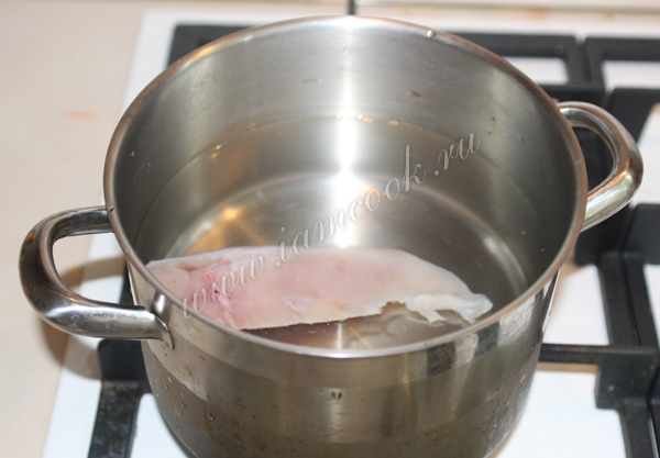 В кастрюлю налить 2 литра воды, положить грудку и поставить на огонь. Когда вода начнет закипать снять пену, затем убавить огонь, прикрыть крышкой и оставить вариться 20 минут.