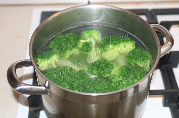 Когда куриная грудка будет готова, извлечь ее из бульона. Капусту брокколи вымыть прохладной водой и разделить на соцветия. Выложить брокколи в куриный бульон, поставить на огонь и варить 15 минут после закипания.
