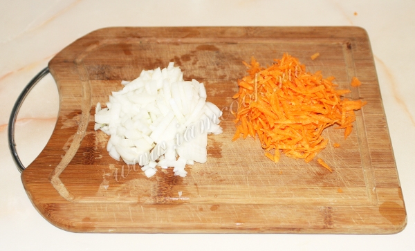 Мелко нарезать репчатый лук, морковь натереть на терке.
