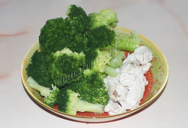 В итоге у меня получилась отварные: капуста брокколи и куриная грудка, которую я расщепил на кусочки среднего размера, для дальнейшей переработки.