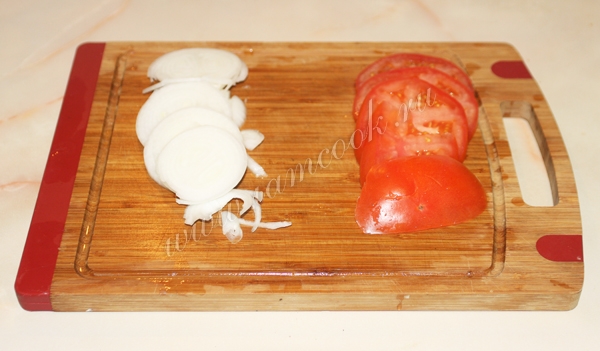 Лук нарезать кольцами или полукольцами. Помидор нарезать тонкими кружками.