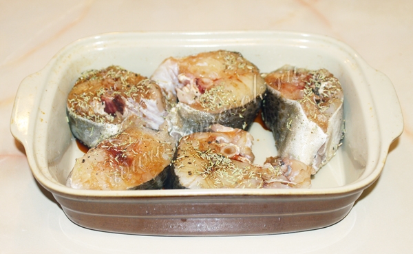 Стейки трески выложить в глубокую тарелку, залить 70 мл соевого соуса, приправить черным молотым перцем и розмарином по вкусу. Оставить рыбу мариноваться на 20 минут.