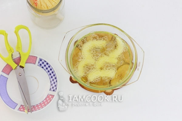 Теперь готовим заварное тесто. В сотейник или удобную кастрюльку добавьте сливочное масло, воду, соль и щепотку шафрана. Постоянно помешивая, доведите до кипения. Убавьте огонь до минимального.