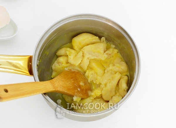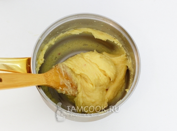 Отключите огонь. Тесто остудите пару минут. Добавьте по одному куриные яйца. После каждого добавления яйца тщательно вымешивайте до получения однородной гладкой массы. Сразу будут комочки, не пугайтесь, при интенсивном вымешивании масса становится гладкой и однородной.