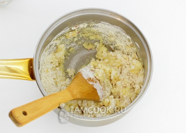 В закипевший раствор насыпьте просеянную пшеничную муку и быстро перемешайте до однородности, не снимая емкость с огня 1-2 минуты.