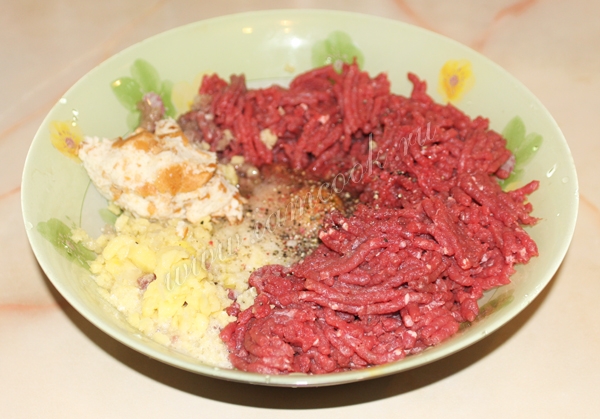 Прокрутить говядину в мясорубке. Также прокрутить репчатый лук, чеснок и картофель. Мякоть хлеба размочить в молоке, отжать и добавить в блюдо к фаршу. Также добавить 2 куриных яйца, посолить и поперчить. Как следует перемешать фарш при помощи большой ложки.