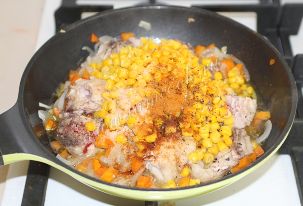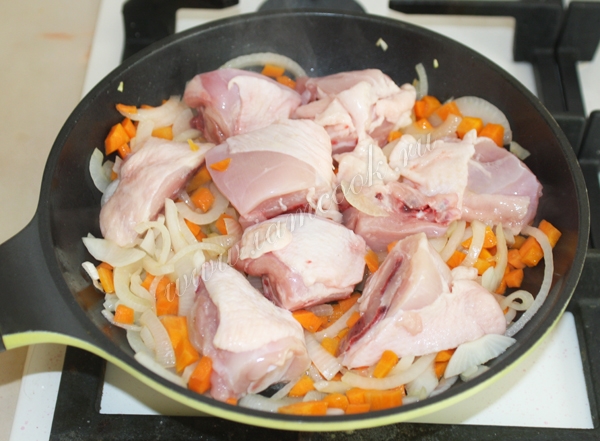 Добавить к луку и моркови кусочки курицы, продолжить обжаривать еще 7-10 минут, изредка помешивая.
