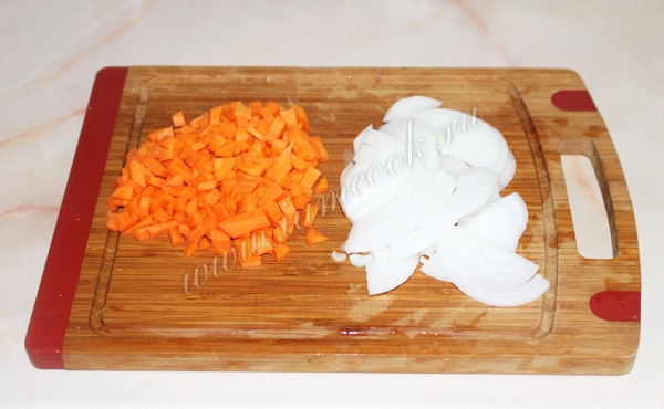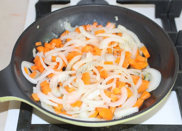 На сковороду влить небольшое количество оливкового масла и выложить морковь с луком. Слегка обжарить овощи в течении 5 минут.