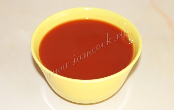 В пиалу влить 250 грамм воды и добавить 2 столовые ложки томатной пасты. Как следует перемешать.