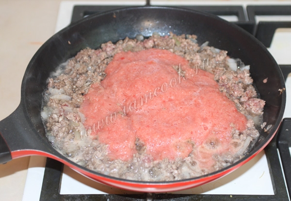 К луку добавить мясной фарш, готовить помешивая 5-7 минут, пока он не поменяет цвет. Затем добавить томатное пюре, соль и травы по вкусу, перемешать и тушить еще 5 минут.