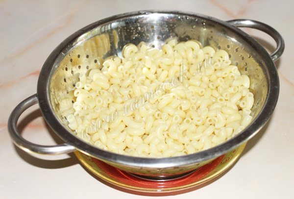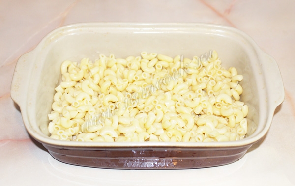 Основные ингредиенты готовы и можно приступать к приготовлению запеканки. На дно формы для запекания выложить половину приготовленных макарон, разровнять.