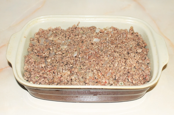 Следующем слоем выложить фарш, хорошенько утрамбовать и также разровнять.