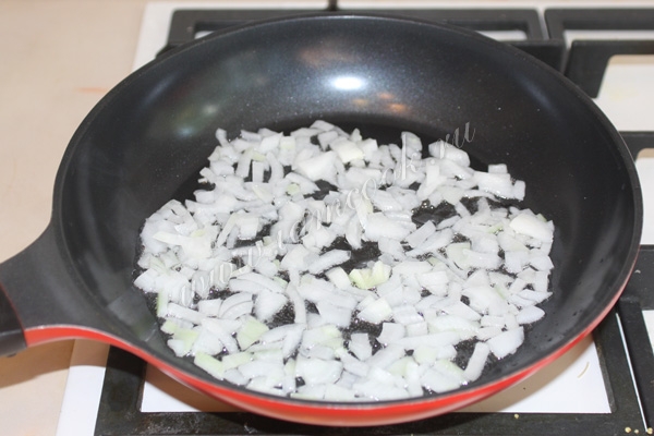 На сковороде разогреть растительное масло и обжарить репчатый лук буквально 3 минуты.