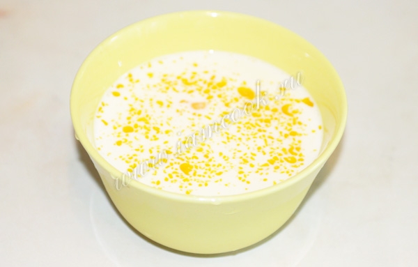 В пиале взбить куриные яйца и добавить 100 мл молока.