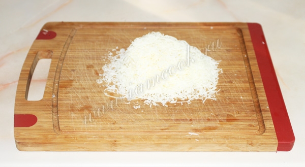 Сыр натереть на мелкой терке. Лично я предпочитаю для этого блюда Пармезан, но можно использовать любой на Ваше усмотрение.