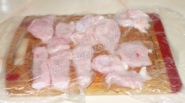 Накрыть мясо пленкой и отбить.