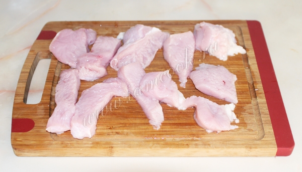 Филе индейки вымыть и нарезать порционными кусочками среднего размера.