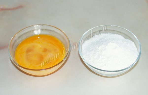 В одну пиалу разбить 2 куриных яйца и взбить. В другую всыпать муку.