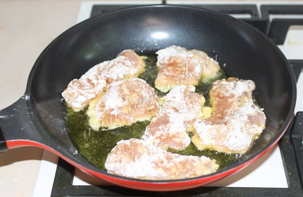 Замаринованные кусочки мяса обмакнуть сначала в яйцо, а затем обвалять в муке. Выложить на разогретую сковороду с оливковым маслом, которое также можно заменить на растительное.