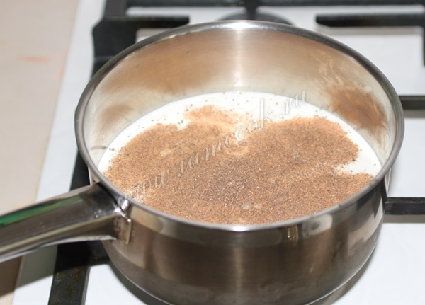 В небольшую кастрюлю влить пол литра сливок, добавить чайную ложку соли, мускатный орех, чеснок, черный молотый перец.