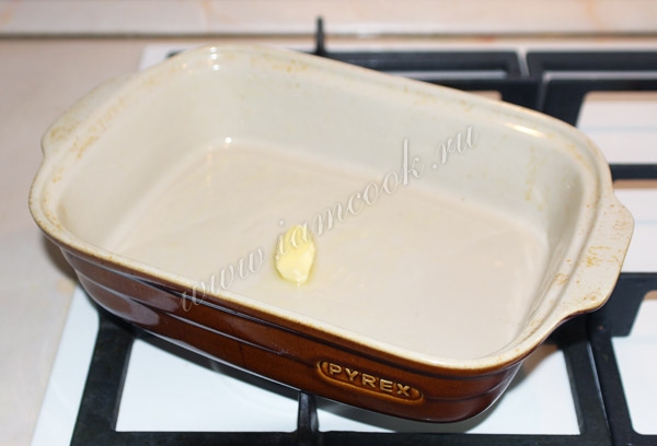 Форму для запекания слегка нагреть на плите. Растопить на ней кусочек сливочного масла и смазать.