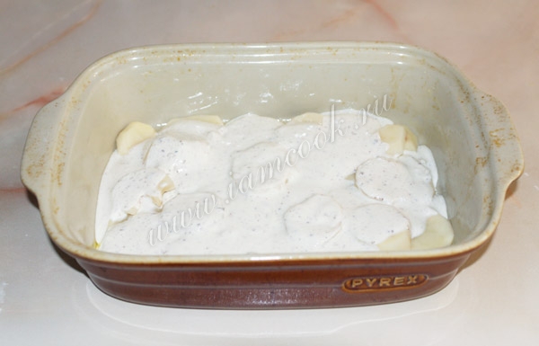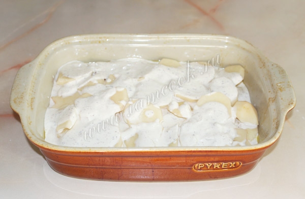 Картофель выкладывать слоями, заливая каждый сливочным соусом (я использовал столовую ложку).