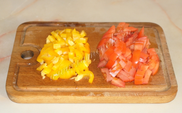 Сладки болгарский перец очистить от семян, порезать соломкой. Помидор обдать кипятком, снять кожицу и нарезать небольшими кусочками при помощи острого ножа.
