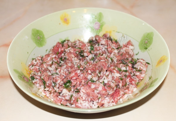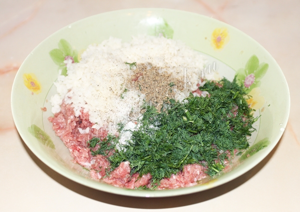 В глубокое блюдо с фаршем выложить рис и измельченную зелень. Добавить 1,5 чайные ложки соли, черный молотый перец и чайную ложку зиры.